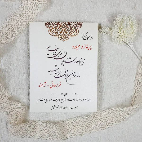لطفاً فرم زیر را با دقت پر کنید، متن کارت عروسی شما مطابق با اطلاعات زیر طراحی شده و در واتساپ یا تلگرام برای شما ارسال میشود.